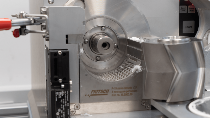 The second test documents the shredding of FFP2 protective masks. Metal parts which were on the masks had to be removed prior to the comminution process. The PULVERISETTE 19 was equipped with the standard rotor with V-cutting edges, as well as a sieve cassette 4 mm square perforation. The grinding time was 45 seconds.