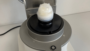 We used our Knife Mill PULVERISETTE 11 with the adapter for single-use grinding bowls. By using the Single-Use grinding bowls, the complicated cleaning process could be avoided. We programmed a SOP with short grinding times of 3s and 1s pause time. After 5 repetitions of these grinding steps, the entire 40 ml of rosin crystals had been ground into very fine powder.