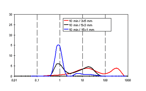 These two diagrams illustrate that the processing with the FRITSCH Mini-Mill PULVERISETTE 23 with the grinding figuration of 15 x 1 mm steel grinding balls and a grinding duration of 10 minutes yields excellent results in the area of the recovery rate of the biological main bacteria B. atrophaeus and the particle distribution of the testing dusts with the B.atropaeus-endospores. Here the degree of the filling of the grinding chamber with 15 x 1 mm grinding balls, which is defined from the ratio of the discharge volume of the idling grinding body discharge, to the volume of the grinding chamber, is very advantageous. This illustrates especially the particle size distribution of diagram 2.